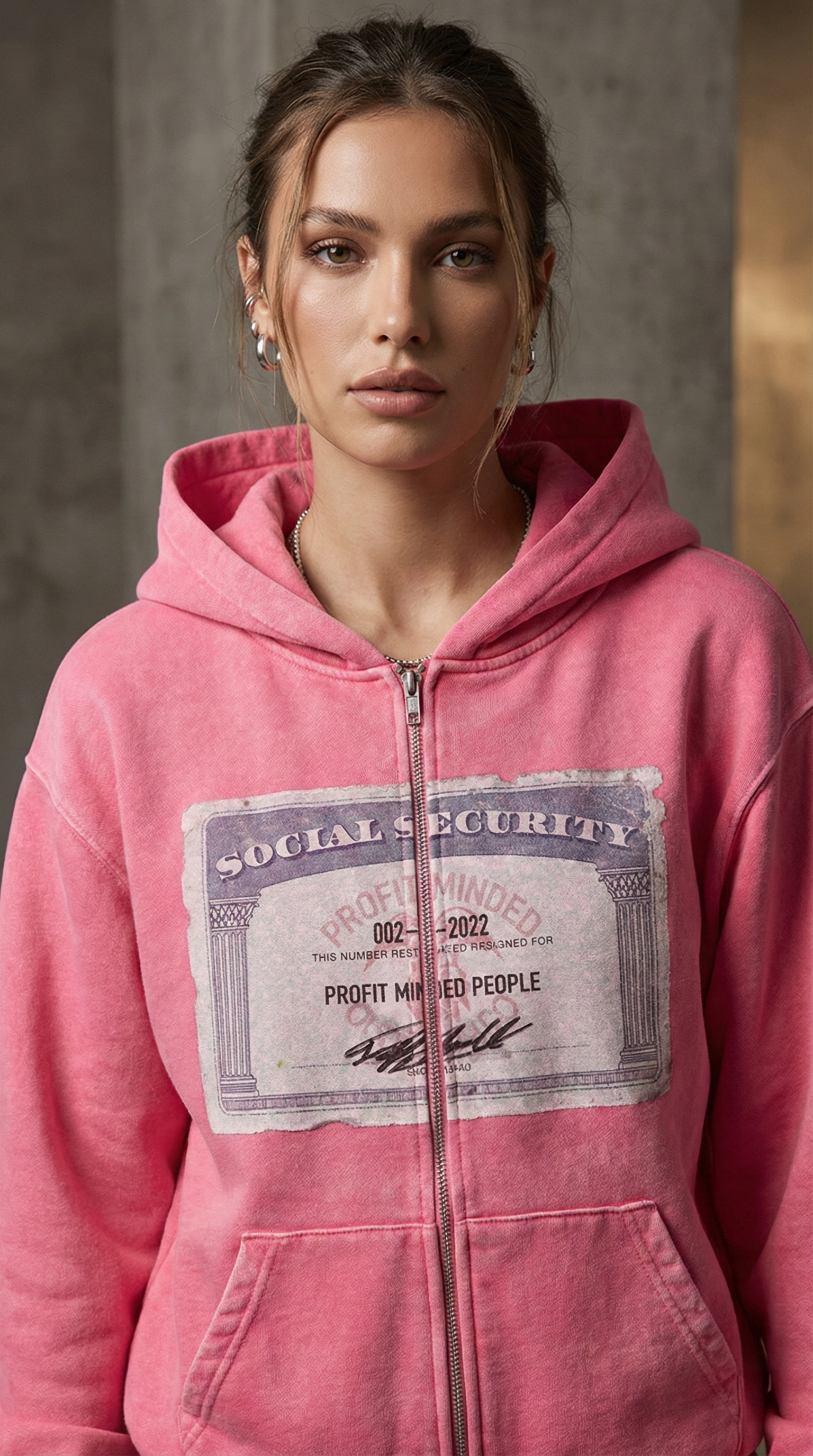 Pink zip-up hoodie withdetailed patch, combining boldcolor and casual chic for daily