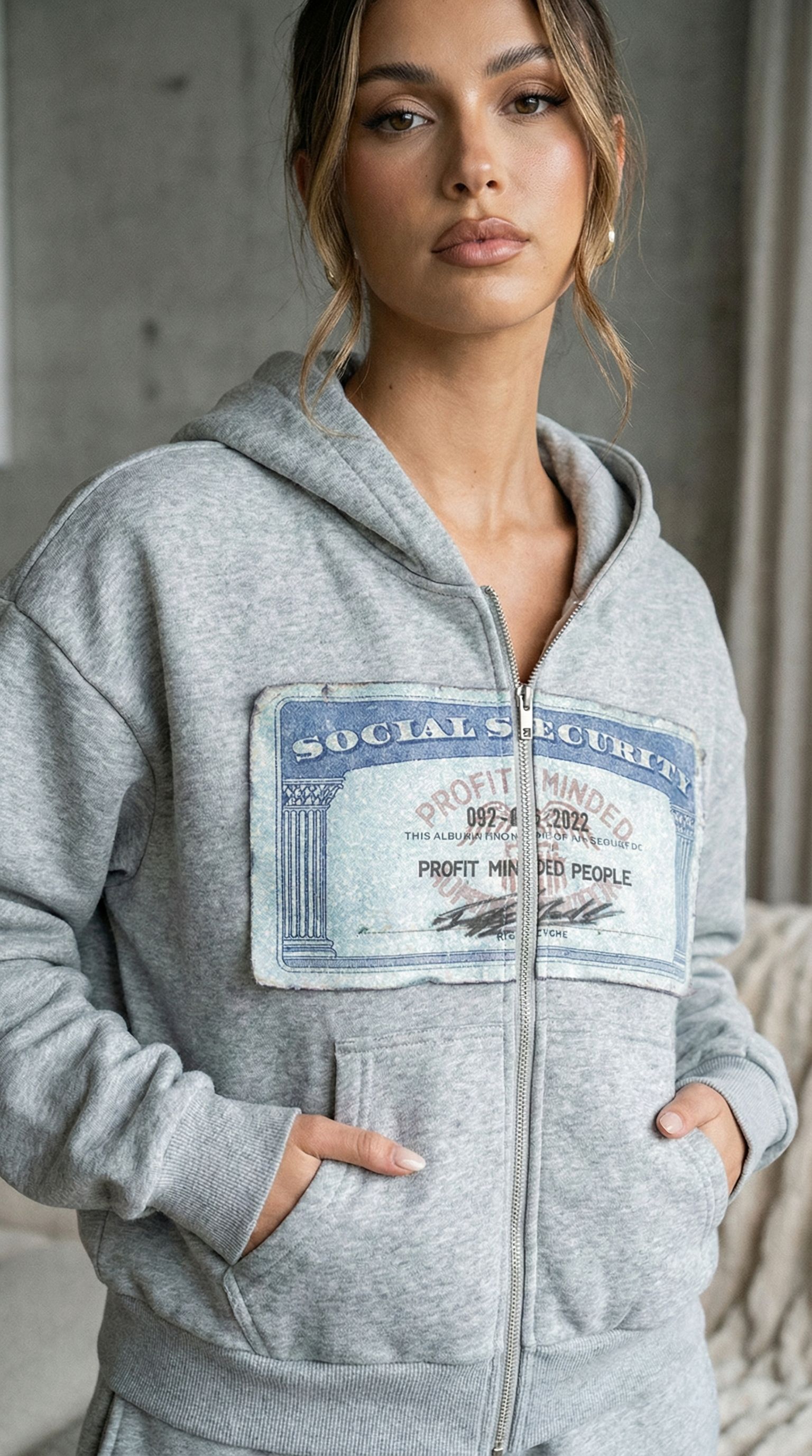 Classic grey zip-up hoodie withpremium patch, offeringeffortless everyday luxury and